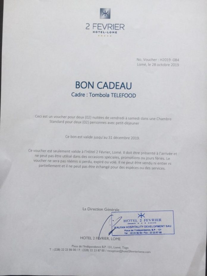 Pour le dernier tirage du jeu tombola, l’hôtel du 2 février offre deux somptueux weekends. Pour être parmi les heureux gagnants envoi plusieurs fois DON par SMS au 2828 ou en faisant un transfert d’argent mobile via TMoney au +228 90269473/90908422 ou Flooz au +228 99951989.